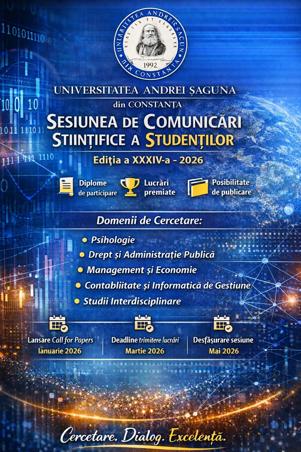 Universitatea „Andrei Șaguna” invită studenții de la programele de licență și masterat să participe la Sesiunea de Comunicări Științifice a Studenților – ediția 2026, un eveniment academic cu tradiție, organizat începând cu anul 1992, dedicat promovării cercetării studențești, dialogului interdisciplinar și excelenței academice.